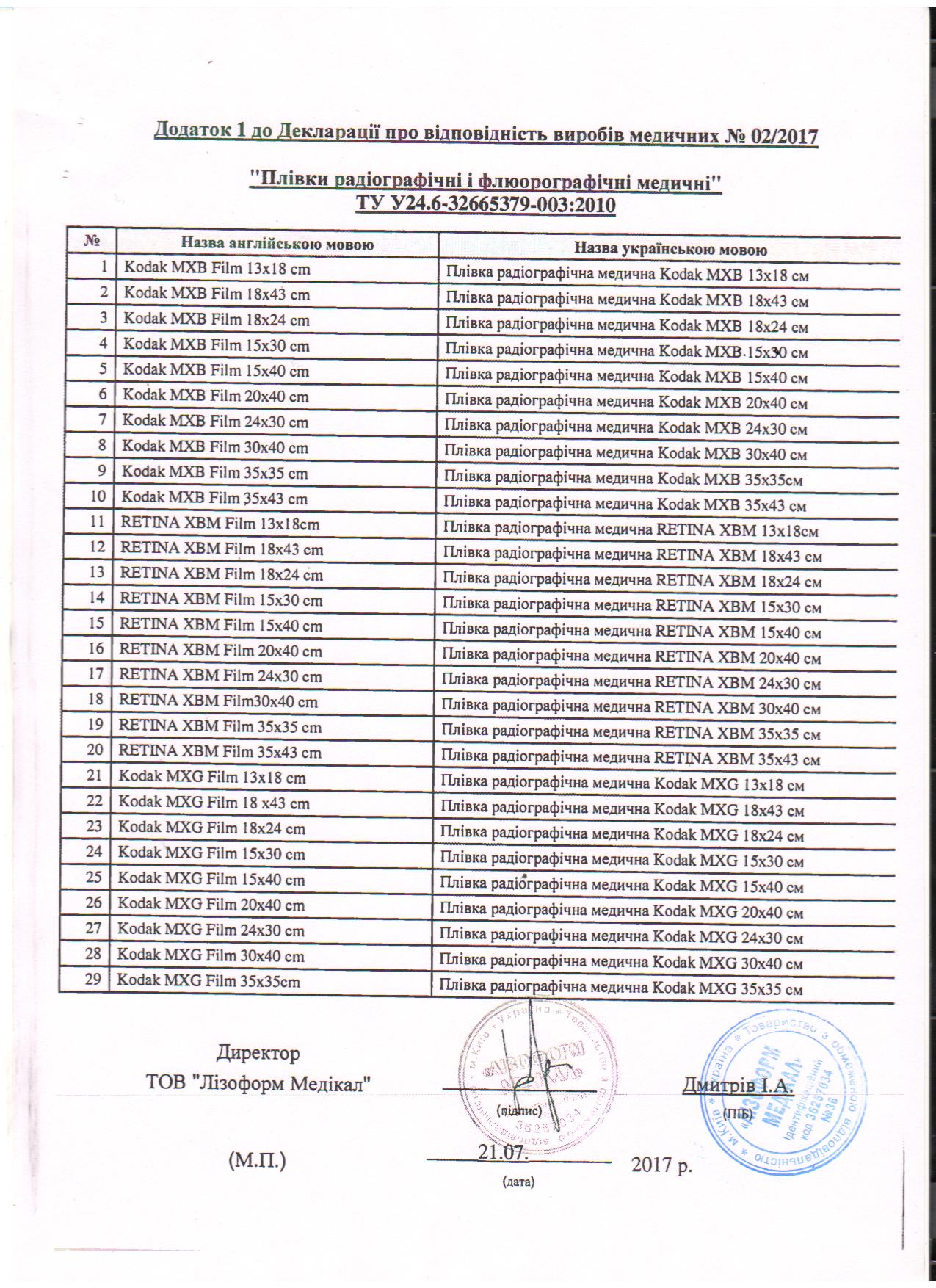 пленка радиографическая Лизоформ Додаток до ДЕКЛАРАЦИИ №02-2017 от 21.07.2017 1стр.jpg